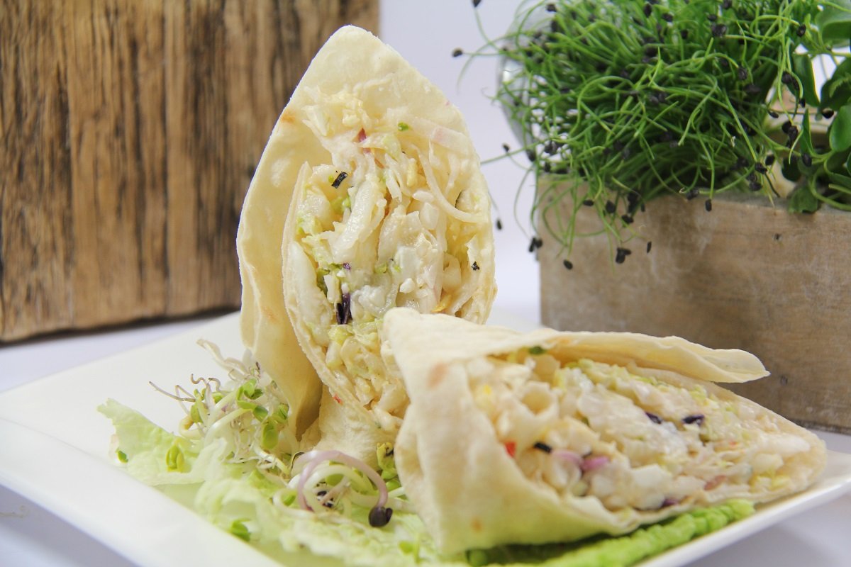 Für die Marinade Schale und Saft von einer Zitrone mit Honig, etwas Chili, etwas Zimt, geröstetem Kreuzkümmel und Salz zu einer Marinade vermischen. Mit dem Salat und dem Schafkäse vermischen und die Fülle in die Wraps einfüllen und einrollen.