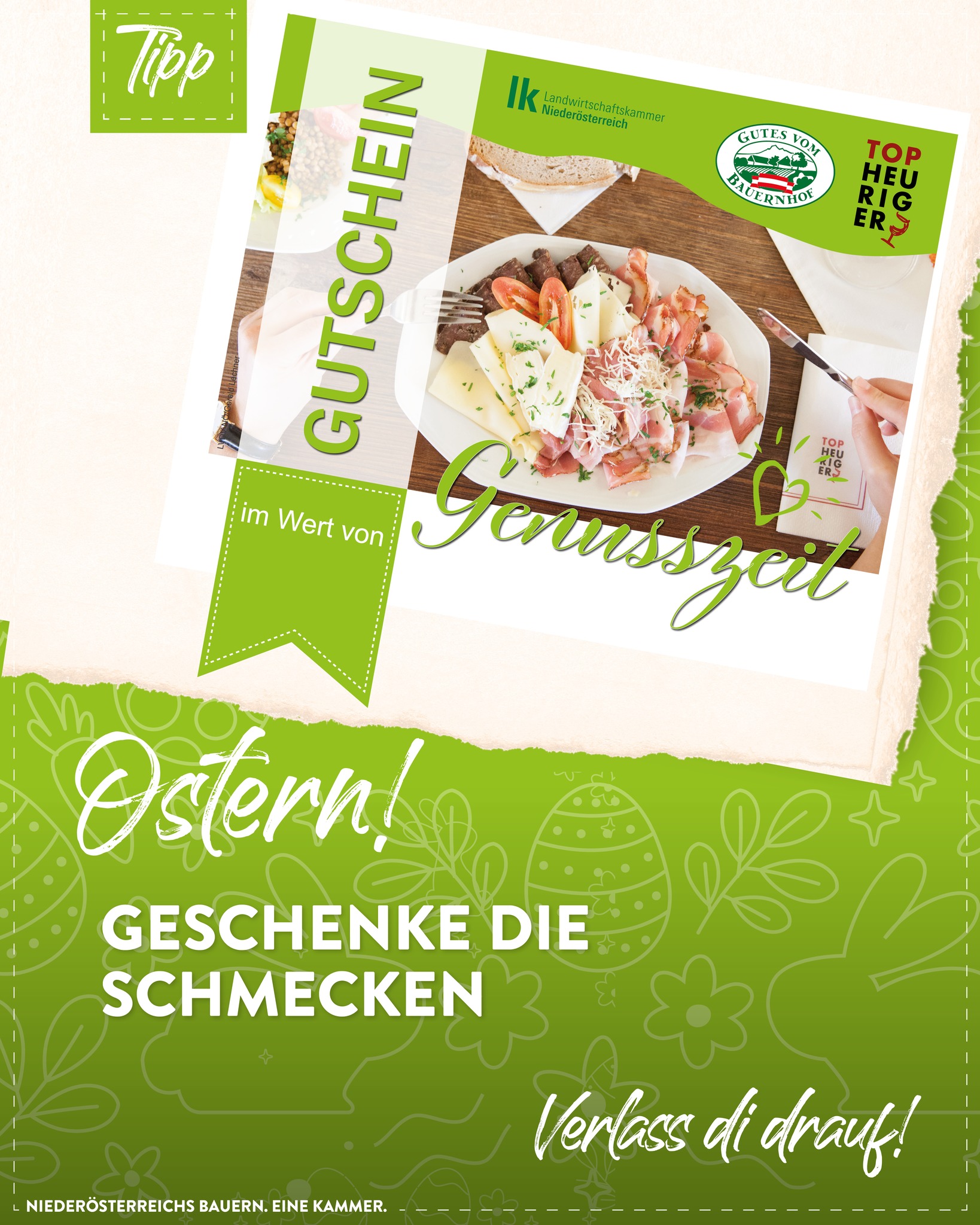 Du bist auf der Suche nach einem Geschenk, weil das Osternest gefüllt werden möchte, Weihnachten vor der Tür steht oder ein Geburtstag zu feiern ist? Egal für welchen Anlass, als Aufmerksamkeit oder einfach als Dankeschön: Ab sofort kann man über den neuen Onlineshop des Landesverbandes für bäuerliche Direktvermarkter NÖ unkompliziert und schnell Gutscheine bestellen. Einfach Wunschbetrag wählen, persönliche Widmung verfassen, bezahlen und schon wird der Gutschein per Mail zugesandt. Einlösbar ist er bei teilnehmenden Gutes vom Bauernhof-Direktvermarktern und Top-Heurigen.