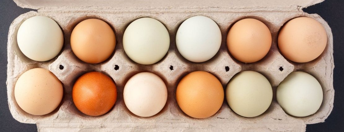 Weiße Eier und braune Eier sind der Klassiker, die kennt jeder. Aber wusstest du, dass es noch weit mehr bunte Eier git? Die Farbpalette der Hühnereier reicht von zarten Gelb- und Rosétönen bis hin zu tiefem Schokobraun. Ja, sogar grünliche, türkise oder olivfarbene Hühnereier gibt es – die Farbpalette ist bunter, als man denkt! Doch woran liegt das? Abgesehen von der Osterzeit, wo der Osterhase bei den bunten Farben mitmischt, wird die Eifarbe ausschließlich durch die Rasse des Huhns bestimmt. Je nachdem, wie das Ohr der Henne gefärbt ist, so wird auch das Ei dieser Henne erstrahlen. Hühner mit weißen Ohrscheiben legen weiße Eier, Hühner mit roten Ohrscheiben legen braune.
