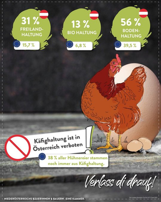Wusstest du, dass Österreich das erste Land der EU war, das die konventionelle Käfighaltung für Legehennen komplett verboten hat? Das ist mittlerweile Standard – und darauf darf man ruhig ein bisserl stolz sein.