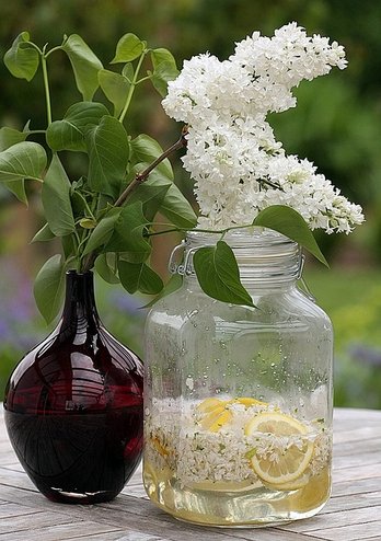 - Abgezupfte Fliederblüten, Zitronensäure und Zitronenscheiben beigeben.