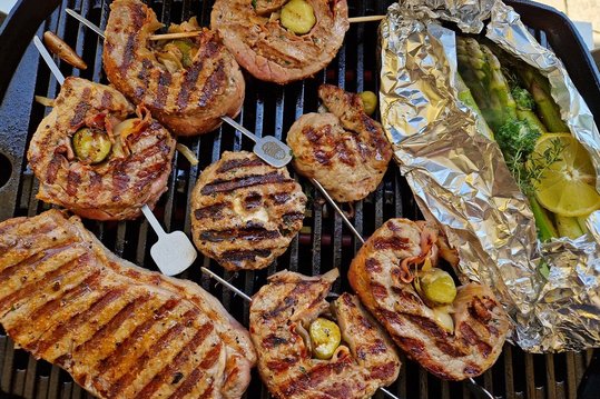 Achte beim Einkauf auf die Fleischqualität, denn dann schmeckt das Essen besonders gut. Um gute Qualität zu erkennen, gibt es ein paar Tipps. Das Fleisch sollte zum Beispiel gut marmoriert sein, das heißt, es sollte gleichmäßig mit kleinen Fettäderchen durchzogen sein. Auch wenn du sonst kein fettiges Fleisch magst, beim Grillen ist es wichtig. Durch diese Fettmaserung bleibt das Fleisch saftig und aromatisch, da das Fett beim Erhitzen schmilzt. Geht dein Gusta Richtung Rindfleisch am Grill, dann achte darauf, dass es gut gereift und nicht zu dünn geschnitten ist.