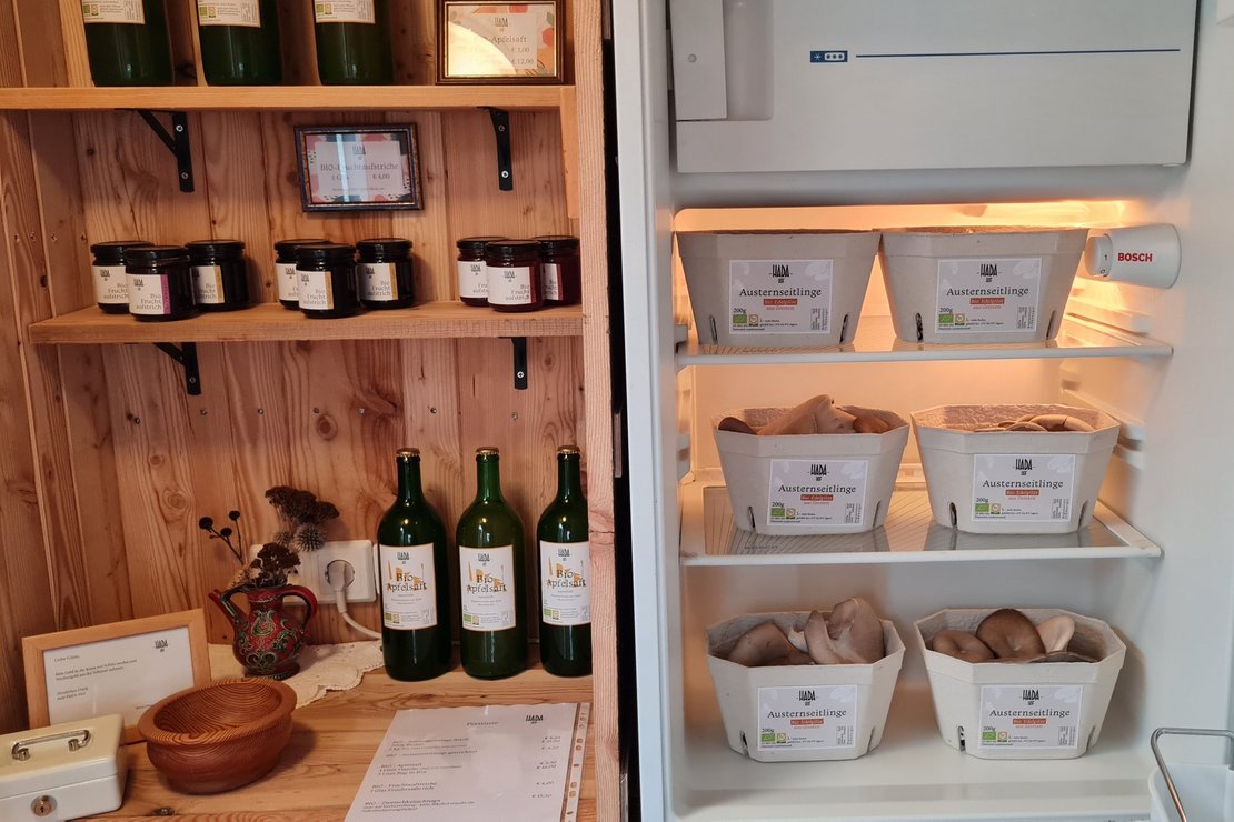 Am Betrieb gibt es neben Bio-Austernseitlinge auch Bio-Apfelsaft, Bio-Fruchtaufstriche (Ribisel, Holler-Apfel, Brombeere) und Bio-Löwenzahnsirup bzw. Honig.
