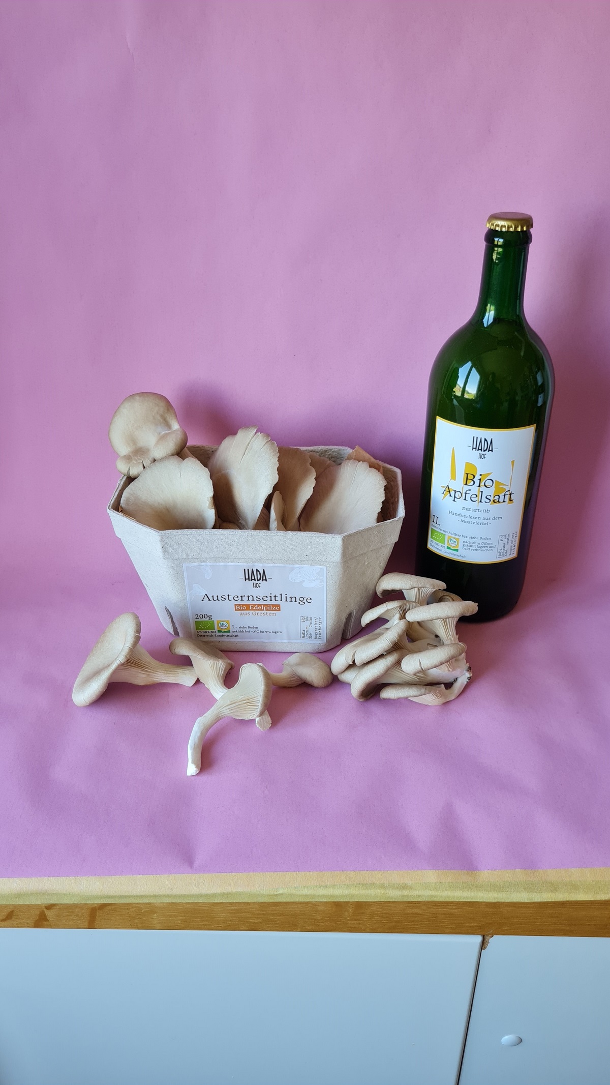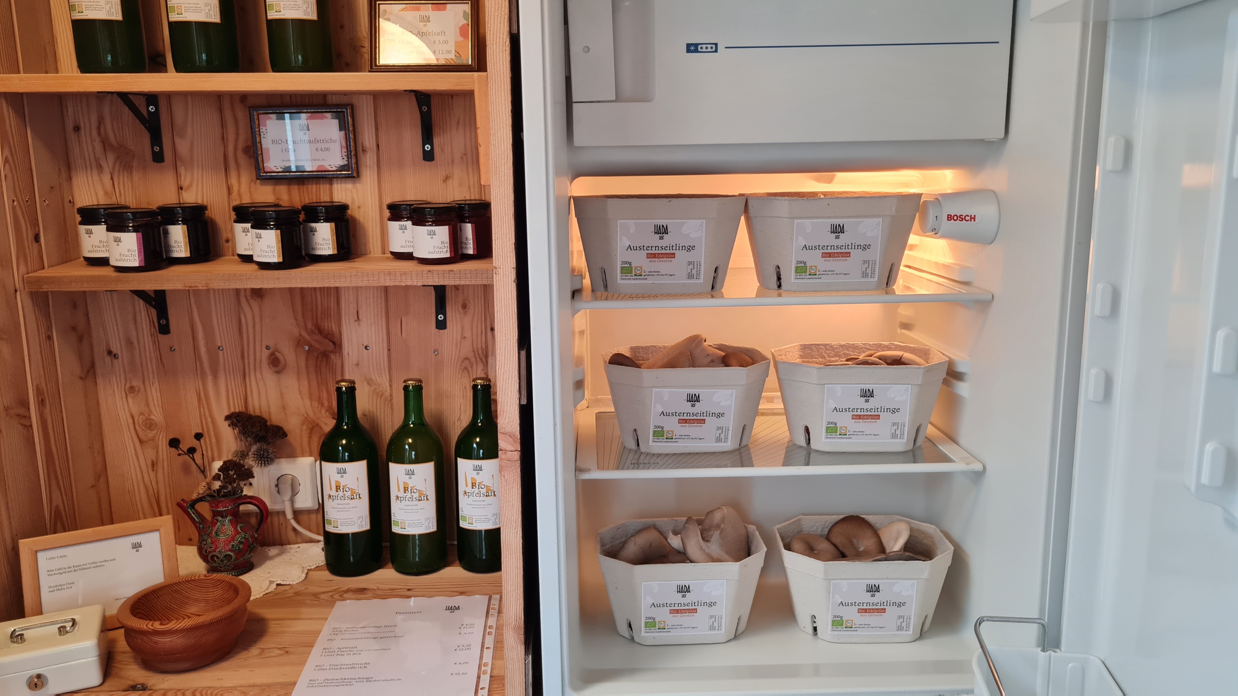Der HaDa-Hof - der Name setzt sich aus den Vornamen Harald und Daniela zusammen - spezialisiert sich ganz auf vegane Produkte. Denn im Selbstbedienungsladen werden neben den Austernpilzen in der kompostierbaren Schale auch Obstsäfte und Fruchtaufstriche wie Ribisel, Holler-Apfel und Brombeere angeboten. „Bei der Übernahme des Hofes war klar, dass wir keine Tiere mehr haben möchten.” Auf die Idee, Pilze zu züchten, kam Harald, schon als Kind begeisterter Schwammerlsucher. Nachdem beide einen Workshop besucht hatten und Harald in Belgien eine Pilzzucht-Ausbildung absolviert hatte, ging es los.