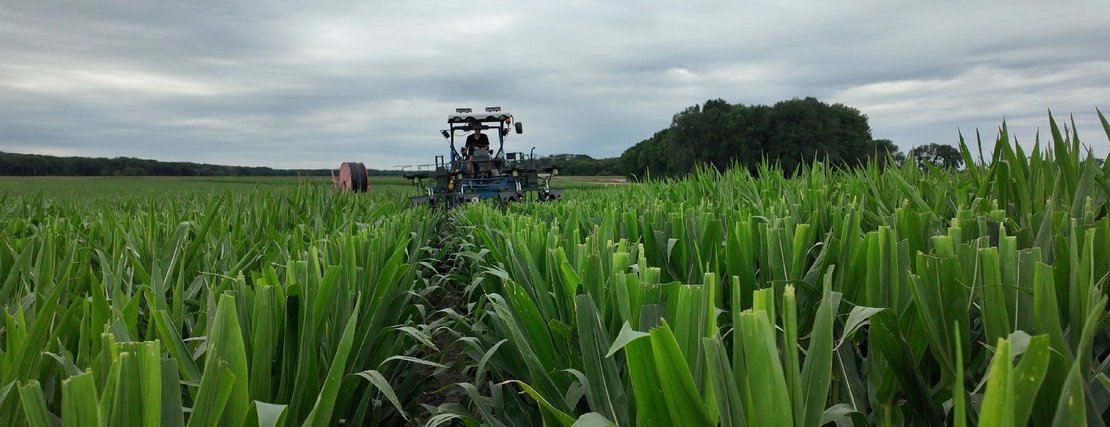 Im Marchfeld passt das Klima für die Saatgutvermehrung besonders gut. Es ist warm, oft windig – und vor allem: bewässerbar. Über die eigenen Brunnen am Feld wird Wasser auf die Felder ausgebracht. Ist es zu trocken oder heiß, kann mit der Beregnung der Boden zum Dampfen gebracht werden und da fühlen sich die männlichen Pollenfäden am Wohlsten – feucht und dampfig, wie in der Sauna.