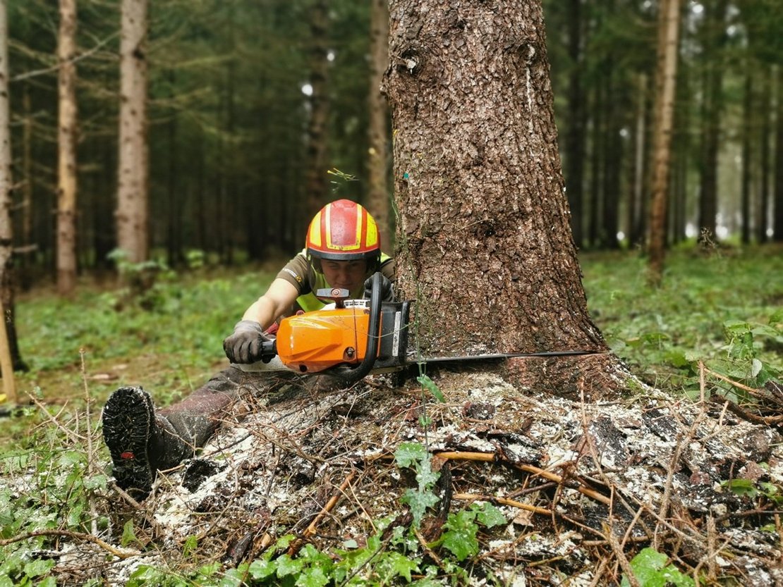 - Gefahrenbereiche sichern und einhalten (2 Meter rund um die Säge und eineinhalb Baumlängen rund um den Baum der gefällt werden soll