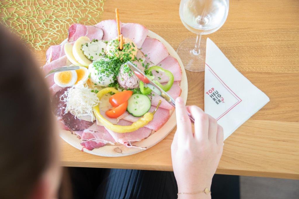 So kombinieren sie nicht nur in der Gestaltung ihres Lokals den nachhaltigen Rohstoff Holz mit modernen Designelementen, sondern setzen auch auf ihrer Speisekarte einen eindeutigen Schwerpunkt: „Wir sind selbst Produzenten und wissen, was es bedeutet, seine Produkte an den Mann zu bringen. Da wollen wir auch Produzenten aus der Region unterstützen und mit ihnen zusammenarbeiten. Uns war es wichtig, dass so wenig Transportwege wie nur möglich zurückgelegt werden müssen.“ Regional, saisonal und nachhaltig lautet somit am Winzerhof Haslinger die Devise. Etwas, das den Nerv des „Top-Heurigen“-Programms genau trifft.