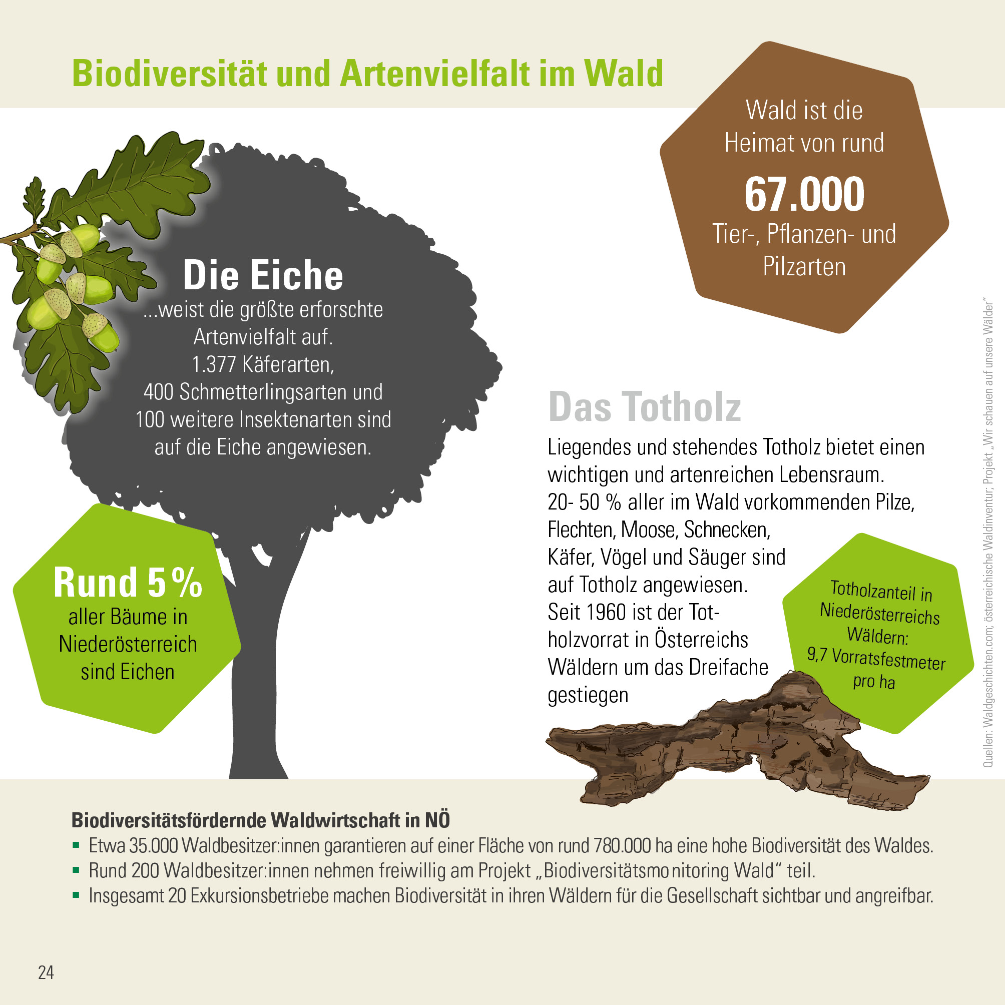 - Liegendes und stehendes Totholz bietet einen wichtigen und artenreichen Lebensraum. 20- 50 % aller im Wald vorkommenden Pilze, Flechten, Moose, Schnecken, Käfer, Vögel und Säuger sind auf Totholz angewiesen. Seit 1960 ist der Totholzvorrat in Österreichs Wäldern um das Dreifache gestiegen. Totholzanteil in Niederösterreichs Wäldern: 9,7 Vorratsfestmeter pro ha.