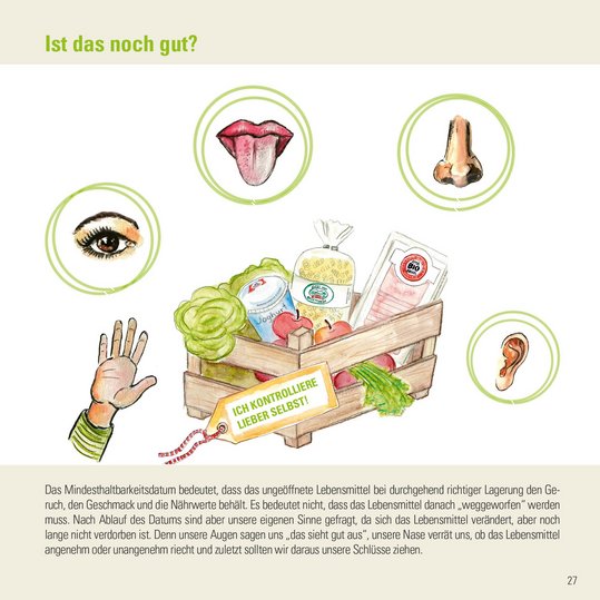 Das Mindesthaltbarkeitsdatum bedeutet, dass das ungeöffnete Lebensmittel bei durchgehend richtiger Lagerung den Geruch, den Geschmack und die Nährwerte behält. Es bedeutet nicht, dass das Lebensmittel danach „weggeworfen“ werden muss. Nach Ablauf des Datums sind aber unsere eigenen Sinne gefragt, da sich das Lebensmittel verändert, aber noch lange nicht verdorben ist. Denn unsere Augen sagen uns „das sieht gut aus“, unsere Nase verrät uns, ob das Lebensmittel angenehm oder unangenehm riecht und zuletzt sollten wir daraus unsere Schlüsse ziehen.
