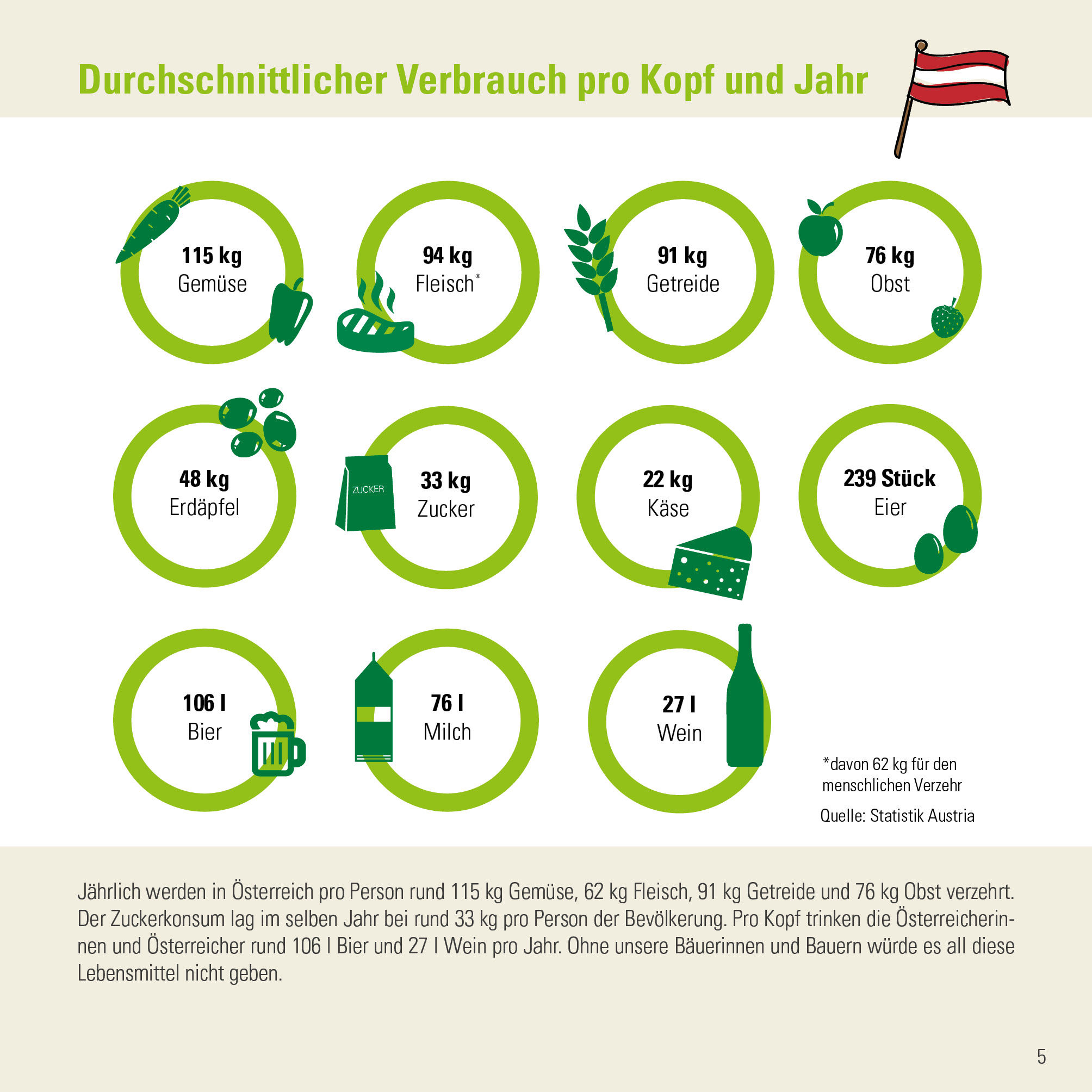 Jährlich werden in Österreich pro Person rund 115 kg Gemüse, 62 kg Fleisch, 91 kg Getreide und 76 kg Obst verzehrt. Der Zuckerkonsum lag im selben Jahr bei rund 33 kg pro Person der Bevölkerung. Pro Kopf trinken die Österreicher:innen rund 106 l Bier und 27 l Wein pro Jahr. Ohne unsere Bäuerinnen und Bauern würde es all diese Lebensmittel nicht geben.