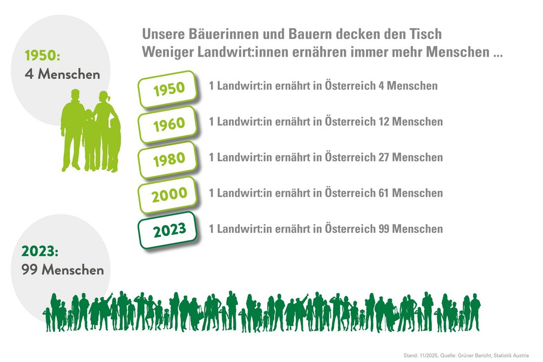 Sie sind die Profis vom Land und bringen Qualität auf den Punkt. Was wären wir ohne Bäuerinnen und Bauern? Mit Sicherheit ziemlich hungrig. Die Arbeit, die Bäuerinnen und Bauern leisten, hat sich seit Jahrzehnten kaum verändert. Der Unterschied liegt allerdings im Wie. Was früher Bäuerin und Bauer selbst erledigten, übernehmen heute überwiegend Maschinen. Digitalisierung, Innovationen und der technische Fortschritt machen es möglich, dass heute ein/e Landwirt:in in Österreich 98 Menschen mit Lebensmitteln ernähren kann.