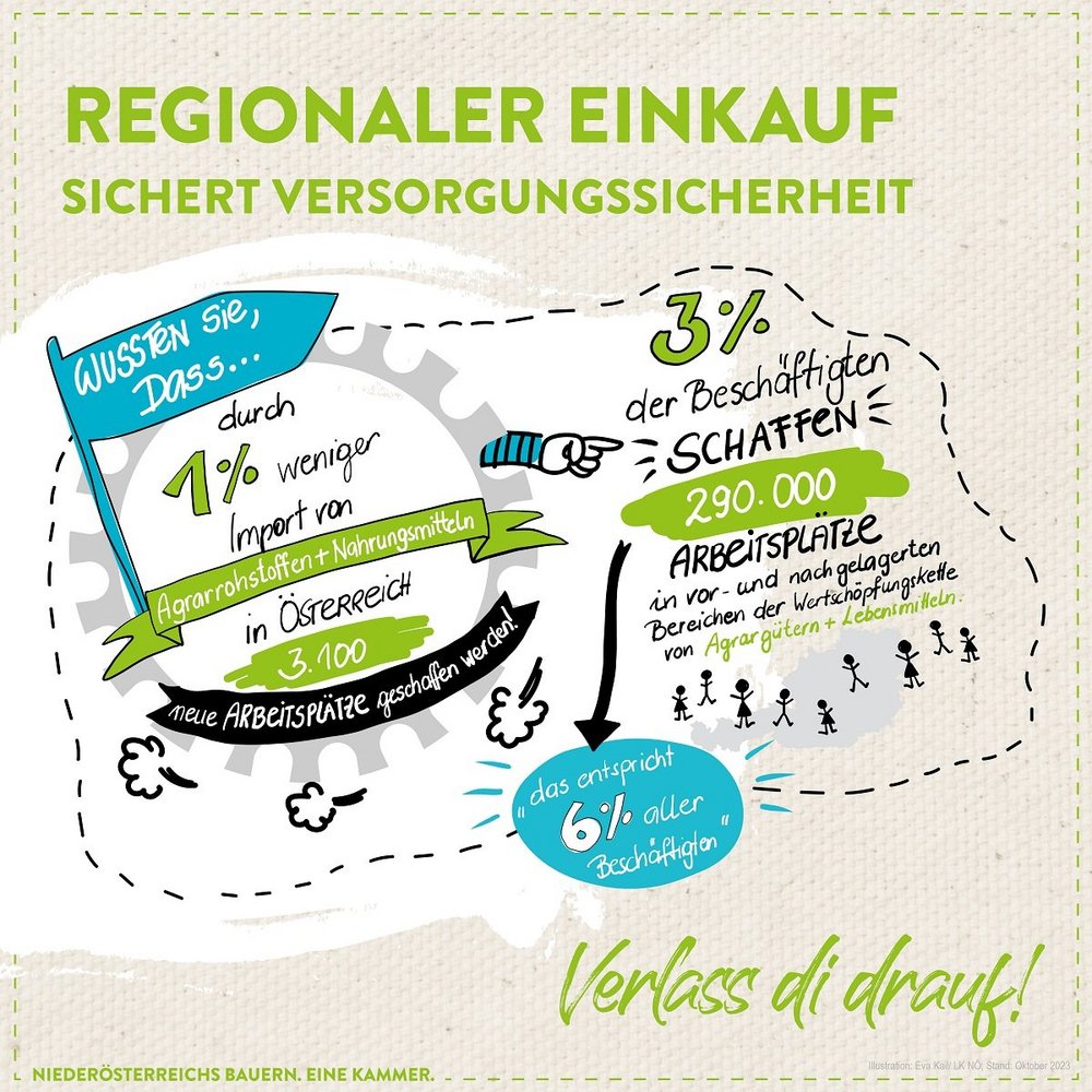 Mit nur 1 % weniger Importen von Agrarrohstoffen und Lebensmitteln können in Österreich zusätzliche 3.100 Arbeitsplätze in der Produktion im Agrarsektor sowie in den nachgelagerten Branchen der Verarbeitung geschaffen werden. 6 % aller Beschäftigten in Österreich arbeiten im Agrarsektor. 3 % davon – das sind rund 290.000 Arbeitsplätze – arbeiten im vor- und nachgelagerten Bereich der Produktion. Landwirtschaftliche Produktion ist ein bedeutender Wirtschaftsfaktor in allen Bundesländern, sichert Arbeitsplätze und gewährleistet die Wertschöpfung in der Region.