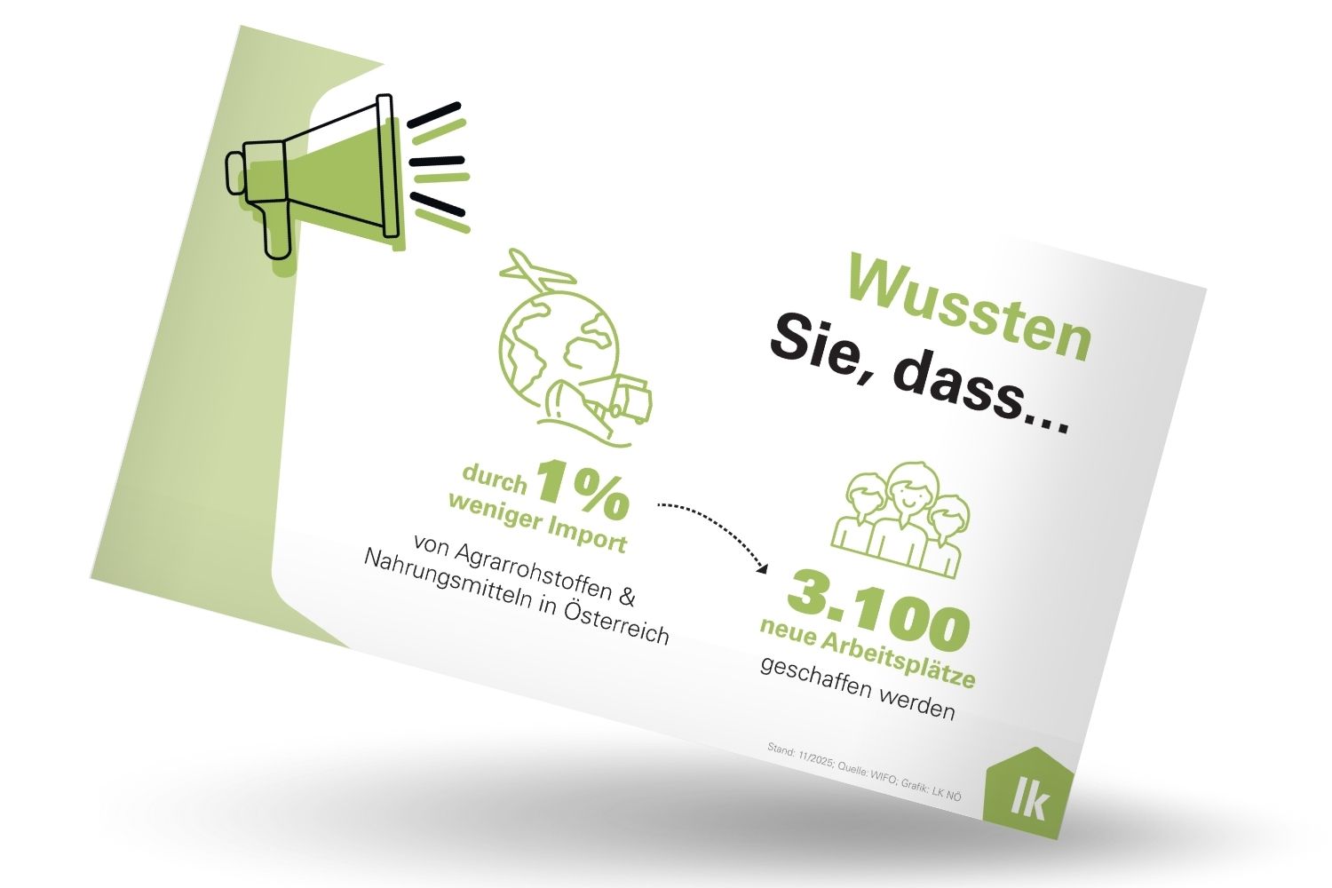 Mit nur 1 % weniger Importen von Agrarrohstoffen und Lebensmitteln können in Österreich zusätzliche 3.100 Arbeitsplätze in der Produktion im Agrarsektor sowie in den nachgelagerten Branchen der Verarbeitung geschaffen werden. 6 % aller Beschäftigten in Österreich arbeiten im Agrarsektor. 3 % davon – das sind rund 290.000 Arbeitsplätze – arbeiten im vor- und nachgelagerten Bereich der Produktion. Landwirtschaftliche Produktion ist ein bedeutender Wirtschaftsfaktor in allen Bundesländern, sichert Arbeitsplätze und gewährleistet die Wertschöpfung in der Region.