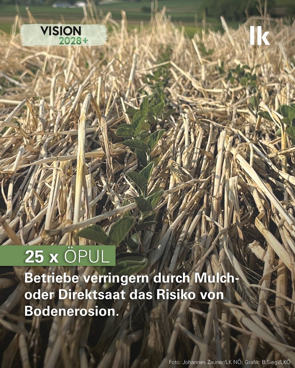 Die Maßnahme „Erosionsschutz – Acker“ unterstützt verschiedene Bewirtschaftungsweisen, welche alle zum Ziel haben, die Abtragung des Bodens zu verhindern. Dazu zählen der Anbau erosionsgefährdeter Kulturen, wie Mais oder Kürbis, mittels Mulchsaat, Direktsaat oder Streifenbearbeitung (Strip-Till), aber auch Anhäufungen in den Rinnen von Kartoffeln sowie die Begrünung von ausgewiesenen Erosions-Eintragspfaden.