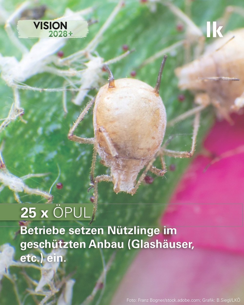 Durch die ÖPUL-Maßnahme "Schutz von Glashauskulturen durch Nützlinge" wird der Einsatz von natürlichen Gegenspielern, also Nützlingen wie Florfliegen, Schlupfwespen oder Raubmilben forciert und der Oberflächen- sowie Grundwasserschutz verbessert. Unterstützt werden jene Betriebe, die im geschützten Anbau Gemüse, Gartenbauerzeugnisse oder Obst produzieren und auf klassische Pflanzenschutzmittel verzichten (unter geschütztem Anbau versteht man die Produktion unter Folie oder Glas). Die Teilnahme an der Maßnahme „Einsatz von Nützlingen im geschützten Anbau“ deckt die zusätzlichen Kosten ab, die durch für den Schutz der Kulturen entstehen.