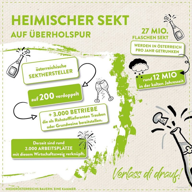 © Marlene Weitzenböck/LK NÖ Österreichs Liebe zu Sekt und regionalem Einkaufswandel spiegelt sich in der heimischen Sektherstellung wider! Die Anzahl der österreichischen Sekthersteller hat sich auf 200 verdoppelt, unterstützt von weiteren 3.000 Betrieben als Rohstofflieferanten. Prost auf österreichischen Sekt und die Vielfalt heimischer Produktion.