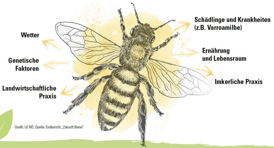 Laut der Studie „Zukunft Biene“ stellen die Varroamilbe sowie bestimmte Bienenviren den größten Faktor bei der Bienengesundheit dar. Weitere Einflussfaktoren sind die klimatischen Bedingungen, das Umfeld des Bienenstandes, die imkerliche Erfahrung, die Stärke der Völker und das Alter der Bienenköniginnen. Aber auch der Kontakt mit chemischen Substanzen wie Tierarzneien, Pflanzenschutzmitteln und Bioziden kann Beeinträchtigungen verursachen. Um die Gefahr, die von Pflanzenschutzmitteln für Bienen ausgeht auszuschließen oder zu minimieren, ist die Schädlichkeit auf Bienen ein besonders wichtiges Kriterium in der Pflanzenschutzmittelzulassung und spiegelt sich in den Bienenschutzauflagen wider. Darüber hinaus werden weitere Maßnahmen seitens der Landwirt:innen ergriffen (z.B. möglichst keine Blütenbehandlung, Beachtung der Flugzeit). Bienenschutz ist sowohl in der Beratung als auch bei der Ausbildung für die Erteilung des Pflanzenschutz-Sachkundeausweises ein Schwerpunkt.