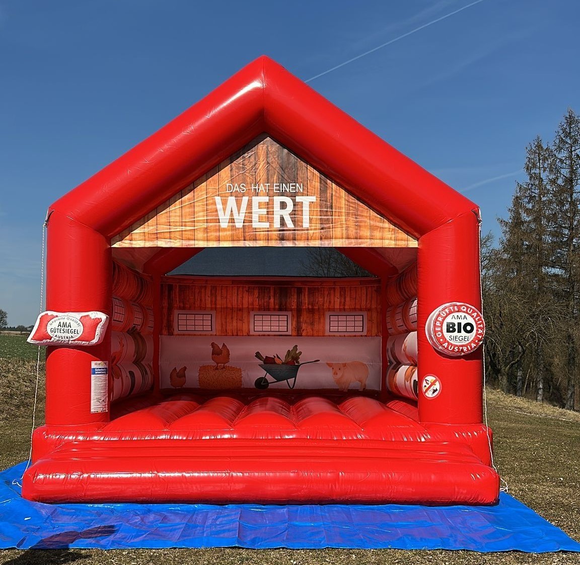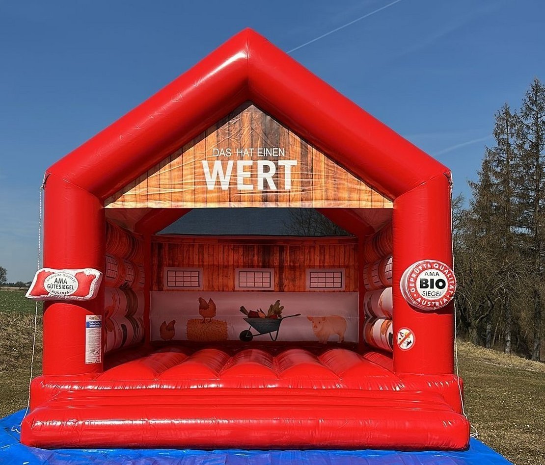 Ein besonderes Highlight für Kinder sind bei jeder Veranstaltung Hüpfburgen. Einmal im Spring-Himmel, möchten Kinder die Hüpfburg am besten nie wieder verlassen. Ab jetzt kann jede offizielle Veranstaltungen zu einem Kinder-Highlight werden, denn AMA Marketing stellt kostenlos Hüpfburgen im Stall-Design zur Verfügung. Mit lustigen Tierzeichnungen dekoriert, hüpfen Kinder im Hüpfburg-Stall zwischen Schwein und Henne, Kuh und Ziege. Bei einer Größe von 5x6 Metern bieten sie Platz für bis zu 15 Kinder. Ideal für Hoffeste, Erntedankfeiern oder andere landwirtschaftliche Veranstaltungen – hier wird spielerisch Begeisterung für das Landleben geweckt!