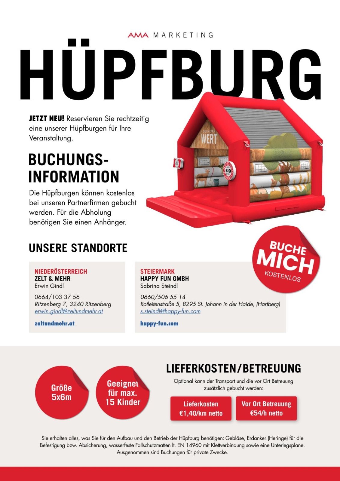 Alle Details zur Buchung und Verfügbarkeit gibt es auf der Info-Seite: https://b2b.amainfo.at/de-at/huepfburg. Schnell sein lohnt sich – die Hüpfburgen sind beliebt und garantieren strahlende Kinderaugen!