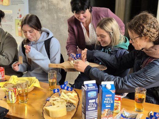 Bezirksbäuerin Maria Zulehner präsentierte die breite Palette regionaler Milch- und Käseprodukte. Bei einer gemeinsamen Verkostung mit Seminarbäuerin Birgit Plank konnten sich die Schüler von der Qualität der Produkte selbst überzeugen.