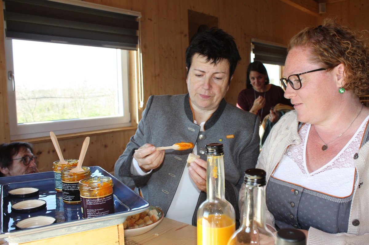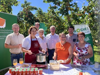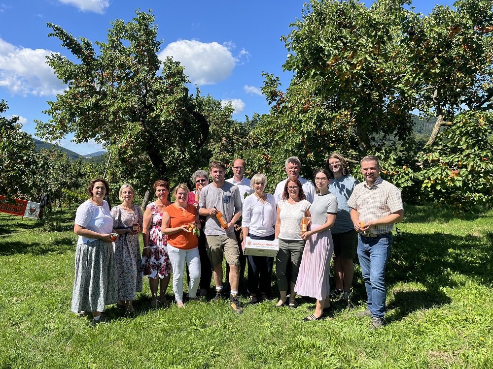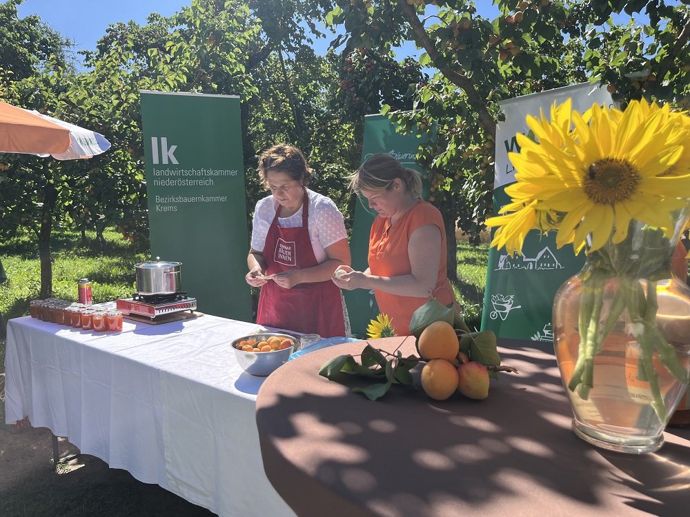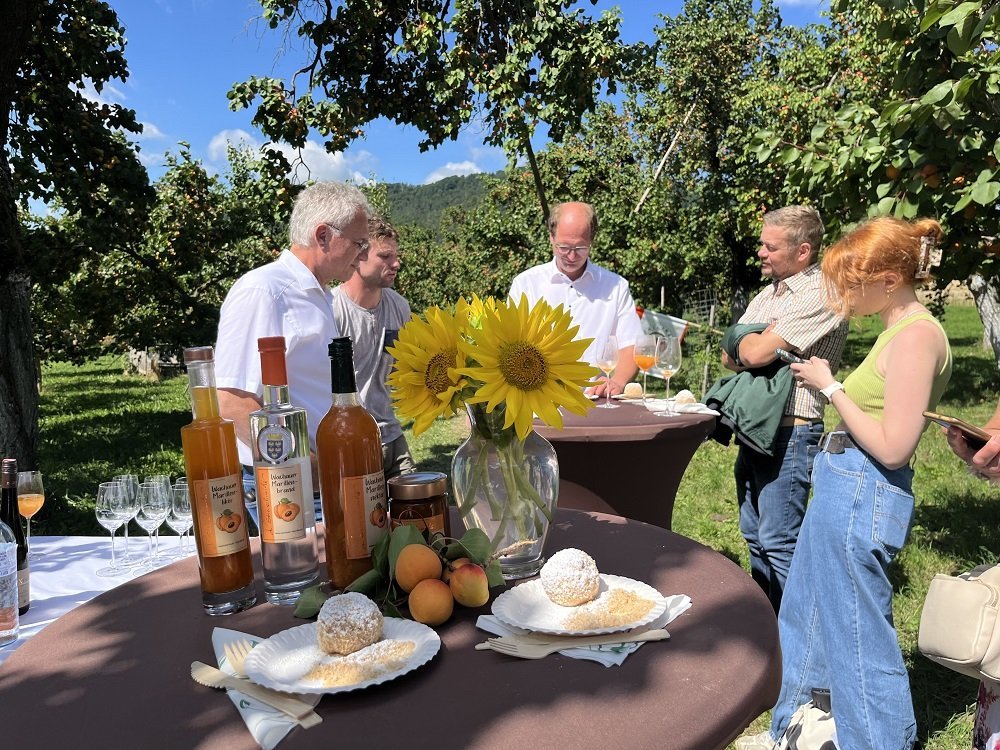 Kammerobmann Franz Stöger begrüßte die Gäste und betonte die Bedeutung der Marille für die Region. Im Anschluss tauschten sich die Teilnehmerinnen und Teilnehmer mit Marillenbauern aus und konnten die Vielfalt regionaler Produkte bei einer Verkostung selbst erleben.