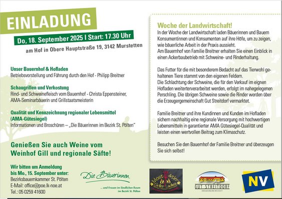 Bereits seit 6. Juni bis 26. September 2025 laden Bäuerinnen und Bauern in allen Bezirken Niederösterreichs zu vielfältigen Veranstaltungen ein: bei Hofführungen, Schaugrillereien, Kochkurse, Wandertage und Verkostungen erleben Konsumentinnen und Konsumenten die Landwirtschaft hautnah. Dabei steht die regionale Herkunft der Produkte im Mittelpunkt. Ziel ist es, aufzuzeigen wie Lebensmittel unter Berücksichtigung von Tierwohl, Nachhaltigkeit und Qualität erzeugt werden.