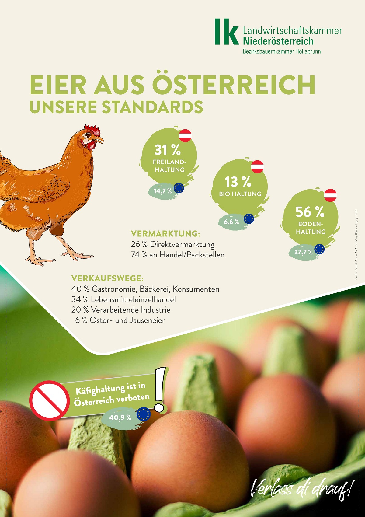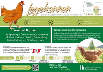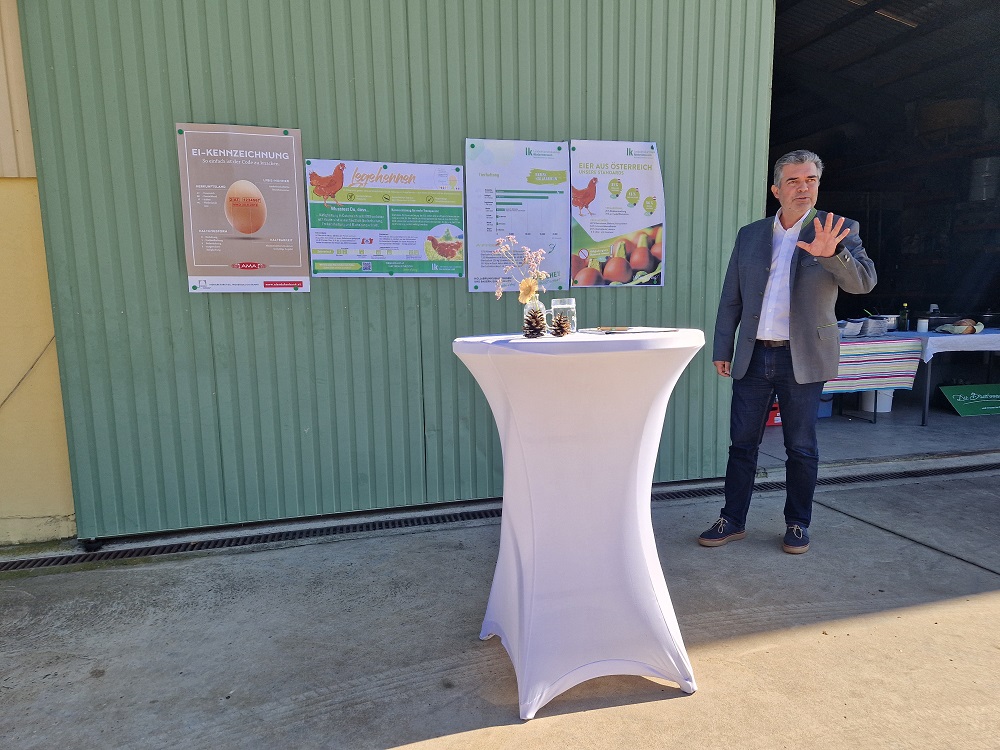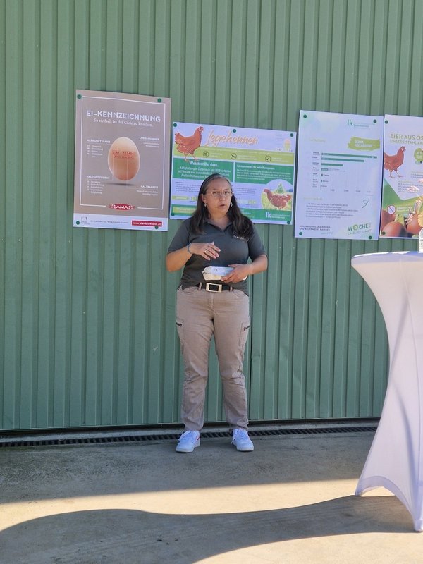 Kammersekretär Gerald Patschka gab einen Überblick über die Tierhaltung im Bezirk Hollabrunn. Dabei wurde verdeutlicht, dass diese im Vergleich zu anderen Regionen nur eine untergeordnete Rolle spielt. Sowohl bei der Anzahl der tierhaltenden Betriebe als auch bei der Zahl der gehaltenen Tiere ist auch aktuell eine Stagnation bzw. ein leicht rückläufiger Trend zu beobachten. Eine Ausnahme bildet die Geflügelhaltung, wo sich die Anzahl der gehaltenen Tiere innerhalb weniger Jahre verdoppelt hat. Aufgezeigt wurden von Patschka auch einige Zahlen zur Produktion und Vermarktung von Eiern in Österreich, ehe Verena Pfeifer die Bedeutung des Ei-Stempels erläuterte, der die Rückverfolgbarkeit von Eiern bis hin zum landw. Betrieb gewährleistet.