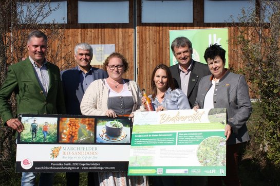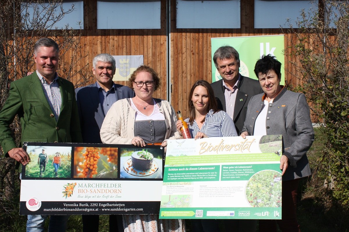 Am Bio-Betrieb von Familie Burik stand der Anbau von Marchfelder Sanddorn im Mittelpunkt. Beim Pressetermin wurde der Betrieb vorgestellt und Themen rund um Biodiversität veranschaulicht.
