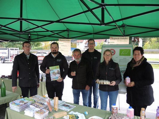 Unter dem Motto "Erntedankfest" informierten die Bäuerinnen und Bauern am Infostand über regionale Landwirtschaft und gaben Einblicke in ihre Arbeit. Außerdem gab es Broschüren, Rezepte und viele Gelegenheiten zum Gespräch.