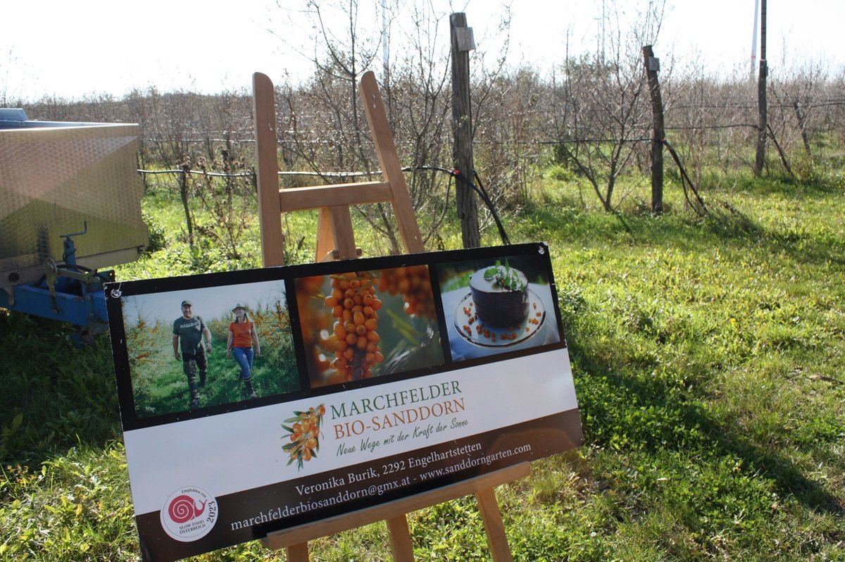 Auch durch besondere Kulturen – wie dem Marchfelder Bio Sanddorn der Familie Burik in Engelhartstetten – wird die Vielfalt auf den Feldern der Region erhöht. Auf ca. 6 ha Ackerfläche kultiviert die Familie seit fast 5 Jahren Sanddorn in biozertifizierter Qualität und erzeugt daraus Sanddorn-Spezialitäten. Diese können im Hofladen erworben oder bei verschiedenen Veranstaltungen – wie demnächst beim „Sanddorn-Frühstück“ im Buschenschank Demmer in Prottes am 18. und 19. Oktober – verkostet werden.