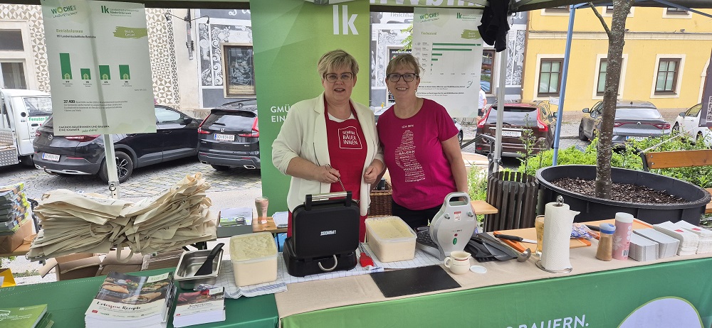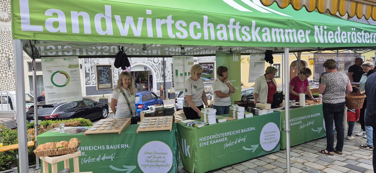 Die BBK Gmünd war beim Jubiläum des Gmündner Wochenmarkts mittendrin – mit einem Infostand direkt am Stadtplatz. Es wurden Waffeln gebacken, Info-Sackerl sowie Broschüren mit Rezepten und Infos rund um die Landwirtschaft verteilt. Ein Getreidezuordnungsspiel lud zum Mitmachen ein, und auf mehreren Infotafeln wurde gezeigt, wie vielfältig und wichtig unsere regionale Landwirtschaft ist.