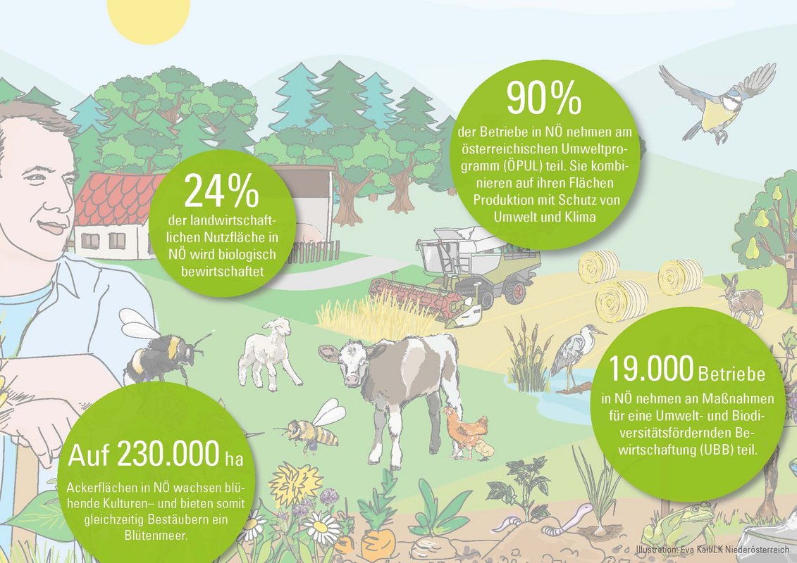 Die Land- und Forstwirtschaft in Niederösterreich ist nicht nur Basis für Lebensmittel, Rohstoffe oder Futtermittel. Mit ihrer Arbeit schaffen Bäuerinnen und Bauern nämlich auch Lebensräume und sind damit ein wichtiger Faktor für den Artenreichtum und die Artenvielfalt. Unsere Landwirt:innen legen gezielt Rückzugsräume für Tiere an und bieten mit guten Mischungen von verschiedenen Pflanzenarten vielen unterschiedlichen Insekten vielfältige Nahrung an. Individuelle Pflegemaßnahmen fördern außerdem ein Maximum an Artenvielfalt über das ganze Jahr und schaffen einen einzigartigen Lebensraum, der mit unterschiedlichen Maßnahmen geschützt wird. Das besondere an Biodiversitätsflächen: Jede Fläche sieht anders aus!