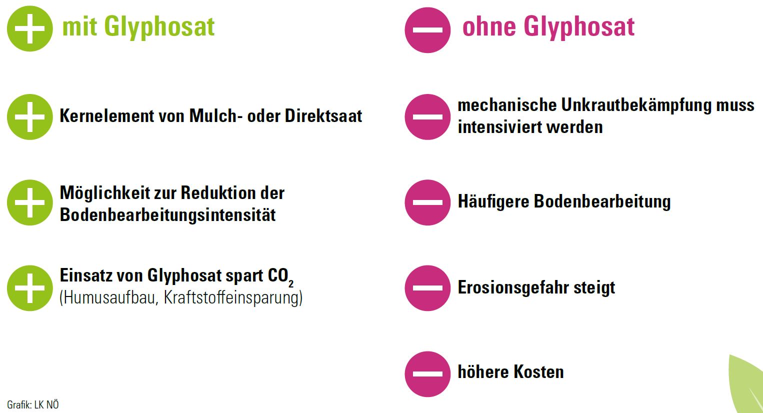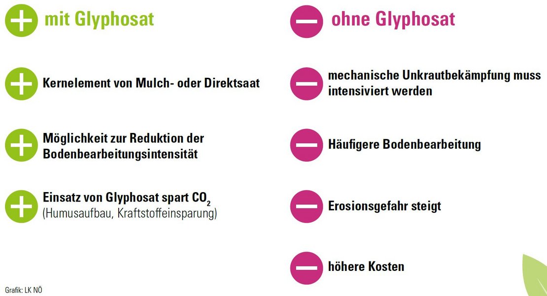 Böden sind die Grundlage unserer Lebensmittelproduktion und auch die Grundlage der Landwirtschaft. Deshalb ist es das Ziel jedes Bauern und jeder Bäuerin, die Böden möglichst gut zu schützen und zu erhalten. Die Bekämpfung von Unkräutern ist einer der Hauptgründe für die Bodenbearbeitung. Mit der Intensivierung der Bodenbearbeitung steigt allerdings auch die Gefahr für Erosion und Humusabbau, was letztlich zur Verschlechterung der Bodenfruchtbarkeit führt. Deshalb setzen viele Betriebe aus gutem Grund verstärkt auf Anbausysteme mit reduzierter Bodenbearbeitung wie Mulchsaat oder Direktsaat. Aber bei weniger Bodenbearbeitung, haben die Unkräuter leichtes Spiel! Zur Unterdrückung der Unkräuter verbleibt dann als einzige Möglichkeit oft Glyphosat. Ein Verbot würde daher wieder „Ein Zurück zur Intensivierung“ der Bodenbearbeitung samt den negativen Effekten mit sich bringen.