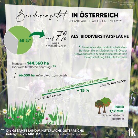 - In NÖ gibt es etwa 60.000 ha biodiversitätsrelevante Flächen (WF, K20, ENP-Flächen, DIV-Flächen, OVF-Grünbrache). Das heißt: Bäuerinnen und Bauern bringen ca. 7 % ihrer Acker- und Grünlandflächen freiwillig in Programme ein und leisten damit einen großen Beitrag für die Biodiversität.
