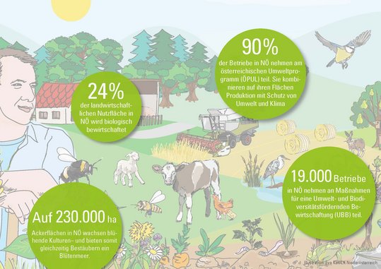 - Rund 19.000 niederösterreichische Betriebe nehmen an den Maßnahmen UBB (Umwelt- und Biodiversitätsfördernde Bewirtschaftung) und Bio teil.