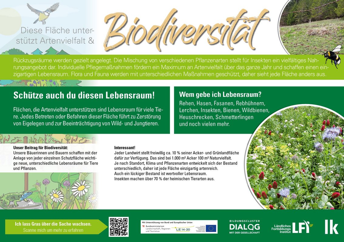 Landwirtschaftlich genutztes Grünland ist ein wichtiger Lebensraum für eine Vielzahl von Pflanzen- und Tierarten und spielt daher eine entscheidende Rolle bei der Erhaltung der Biodiversität. Viele bedrohte und gefährdete Arten sind auf Grünlandlebensräume spezialisiert und können auch nur in diesen Lebensräumen überleben. Aber das Grünland kann noch so vieles mehr! Es hat auch eine wichtige Funktion im Ökosystem: Es trägt zur Bodenbildung und -stabilisierung bei, reguliert den Wasserhaushalt, speichert Kohlenstoff und ist obendrein ein Augenschmaus für Landschaftsgenießer:innen und Erholungssuchende. Fazit: Grünland = Biodiversität.