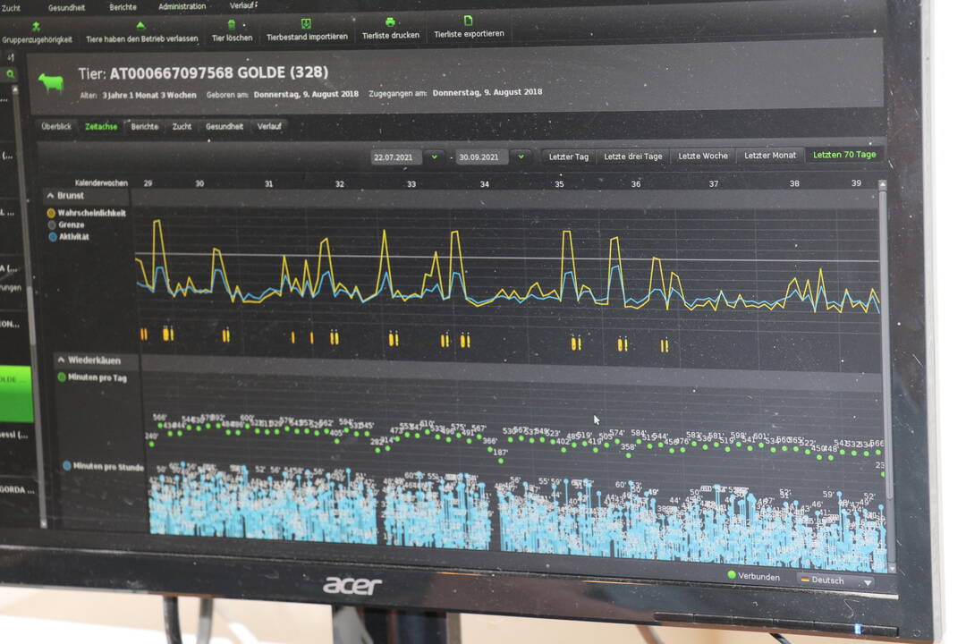 Auf vielen österreichischen Milchviehbetrieben gibt es bereits Melkroboter. Die Kühe gehen freiwillig hinein, werden automatisch gemolken, und der Roboter erkennt jede Kuh ganz genau. Während des Melkvorgangs sammelt der Roboter Daten zur Milchmenge, Eutergesundheit und dem Fressverhalten der Kuh. Am Tablet oder Computer kann der Landwirt die Daten in Ruhe ansehen und beurteilen.