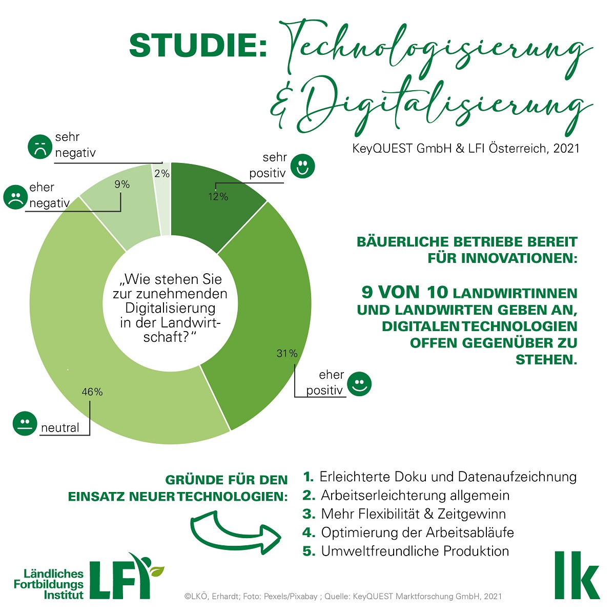 Egal ob Haushalt, Büro, Werkstatt, Stall, Feld oder Weide: Die Digitalisierung hat in allen Bereichen des Bauernhofes heutzutage bereits Einzug gehalten. Es gibt keinen Sektor mehr, der nicht von der Digitalisierung erfasst und mitgerissen wurde. Technische Entwicklungen findet man in der Tierhaltung genauso wie im Planzenbau aber auch in der Waldwirtschaft. Der Nutzen dieser Errungenschaften ist enorm. So werden nicht nur Bäuerinnen und Bauern damit entlastet, sondern auch Rohstoffe und Ressourcen können im Sinne der Nachhaltigkeit eingespart werden. Neue Wege und Technologien sind auch für die Tierhaltung nicht mehr wegzudenken, da damit das Tierwohl gesteigert werden kann. Auch die Umwelt profitiert von weniger Maschineneinsatz, weniger Dünger und weniger Pflanzenschutz bei besserer Leistung. Zielgenau und optimal angepasst können wesentliche Arbeitsabläufe gesteuert werden. Zusätzlich steigt die Qualität der Produkte noch weiter an.