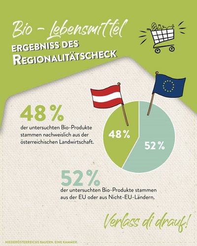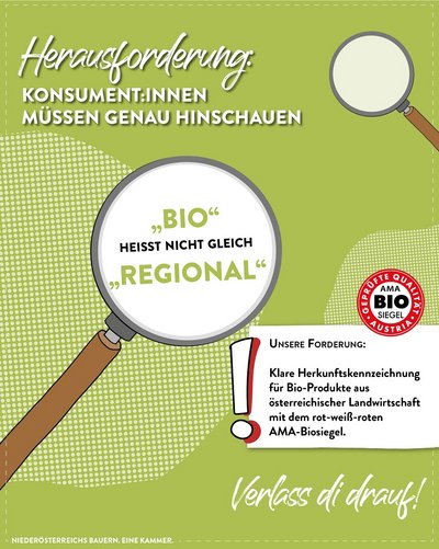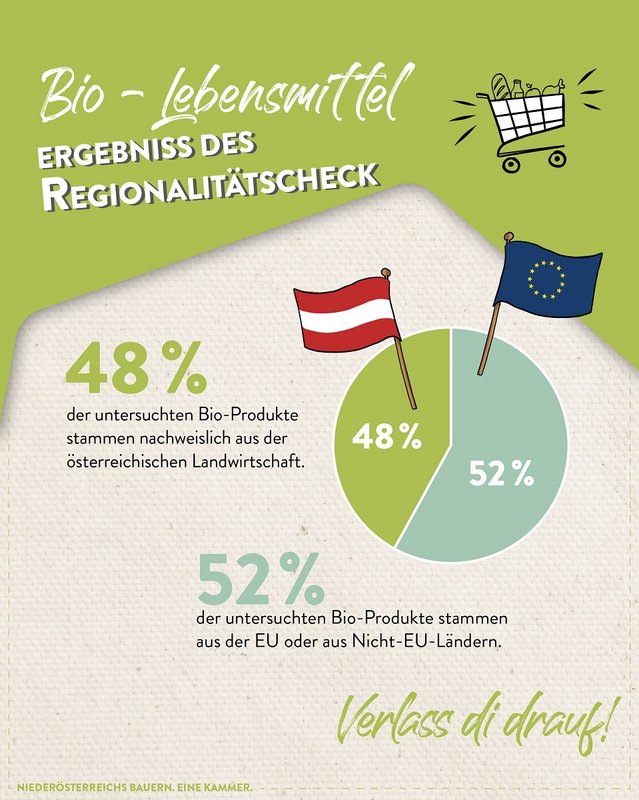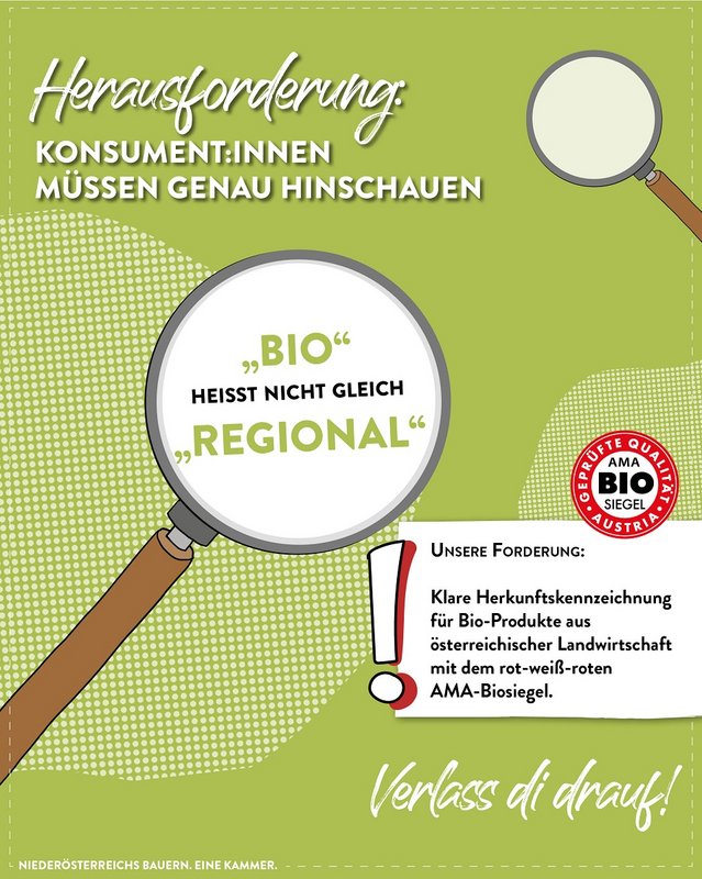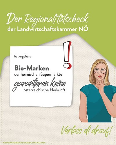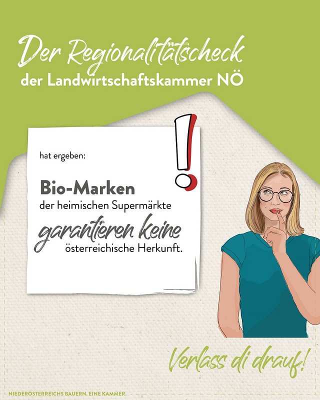 Immer mehr Menschen legen Wert auf biologische Lebensmittel. Viele Konsument:innen setzen “Bio” allerdings mit “Regional” gleich. Das heißt, wenn sie im Supermarkt zu Bio-Lebensmitteln greifen, gehen sie davon aus, dass sie damit nicht nur Bio kaufen, sondern auch Regionalität. Sie wähnen sich im Glauben, das Produkt komme aus Österreich und sie würden somit die regionale Landwirtschaft unterstützen. Dem ist allerdings nicht so! Eine Regionalitäts-Check der Landwirtschaftskammer Niederösterreich zeigt: Nur 48 % der untersuchten Bio-Produkte stammen nachweislich aus der heimischen Landwirtschaft. Und viel mehr noch: Die Herkunft der Bio-Produkte ist im Supermarktregal oft nicht auf den ersten Blick erkennbar. Man muss schon genau hinschauen, wenn man Bio-Produkte aus heimischer Erzeugung mit nach Hause nehmen möchte.