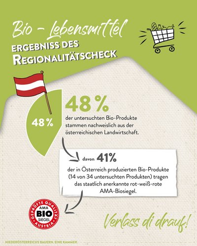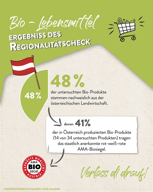Der Regionalitäts-Check analysierte 71 Bio-Produkte aus zwölf verschiedenen Kategorien: Spaghetti, Linsen, Haferflocken, Toastbrot, Bircher Müsli, Honig, Apfelsaft, Vogerlsalat, Suppengemüse, Karotten, Zwiebel und Essiggurkerl – alles Produkte, die auch in Österreich produziert werden können. Die Erhebung wurde in den Filialen der großen Lebensmittelhändler in Österreich durchgeführt. Geprüft wurde, ob die Rohstoffe aus Österreich stammen, ob die Verpackung klare Angaben zur Herkunft macht und ob das AMA-Biosiegel vorhanden ist. Das rot-weiß-rote AMA-Biosiegel garantiert nämlich als einziges staatlich anerkanntes Siegel österreichische Herkunft bei Bio.