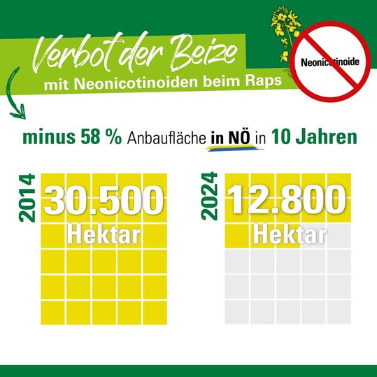 Schon jetzt zeigt sich das beim Rapsanbau: Erste Folgen der Einschränkung von Pflanzenschutzmitteln werden beim Rapsanbau deutlich. Die Branche leidet unter dem Verbot der Neonicotinoide als Beizmittel. Dadurch schrumpfte die Anbaufläche von Raps in 10 Jahren um ca. 17.700 Hektar, das sind 58% der ursprünglichen Fläche.