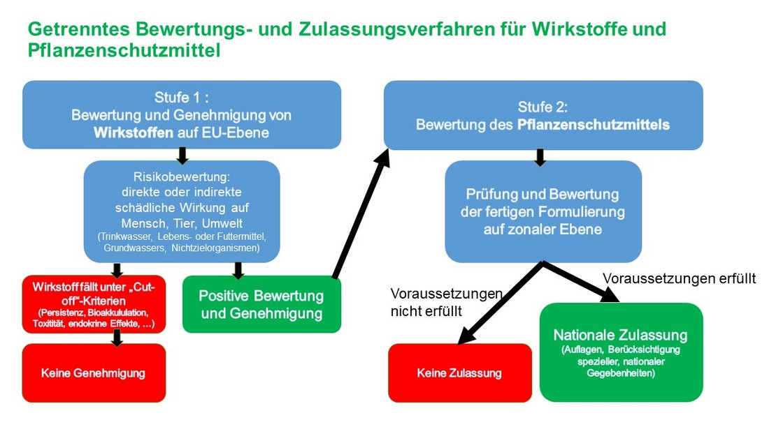 Ein Pflanzenschutzmittel ist ein Produkt, das einen Kulturpflanzenbestand vor Krankheiten, Schädlingen oder auch Unkräutern schützen soll. Damit es das tut, braucht es einen Wirkmechanismus – sonst kann es nicht effektiv sein. Der Wirkstoff kann dazu führen, dass es irgendwo Nebeneffekte gibt, die man sich nicht wünscht. Damit die negativen Effekte von Pflanzenschutzmittel auf Menschen, Umwelt und das Tier möglichst gering sind, gibt es eine sehr komplexe Pflanzenschutzmittelzulassung, die über die EU geregelt ist. Viele Expert:innen sind an dem Prozess beteiligt und entscheiden über den Ausgang des Verfahrens.