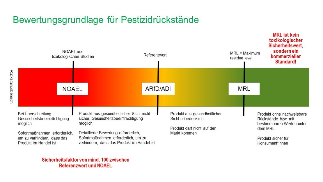 Um die Gesundheit von Konsument:innen zu schützen, gibt es für Lebensmittel noch Rückstandsuntersuchungen, Rückstandswerte und Regelungen bezüglich der erlaubten Rückstandsmenge. Das heißt, Pflanzenschutzmittel dürfen nur in einem Ausmaß in Produkten vorhanden sein, dass die Gesundheit des Menschen nicht beeinträchtigt wird. Auch hier steht ein komplexes Verfahren dahinter, bei dem viele Sicherheitsfaktoren berechnet und berücksichtigt werden. Damit versucht man sicherzustellen, dass das Lebensmittel für den Menschen sicher ist.