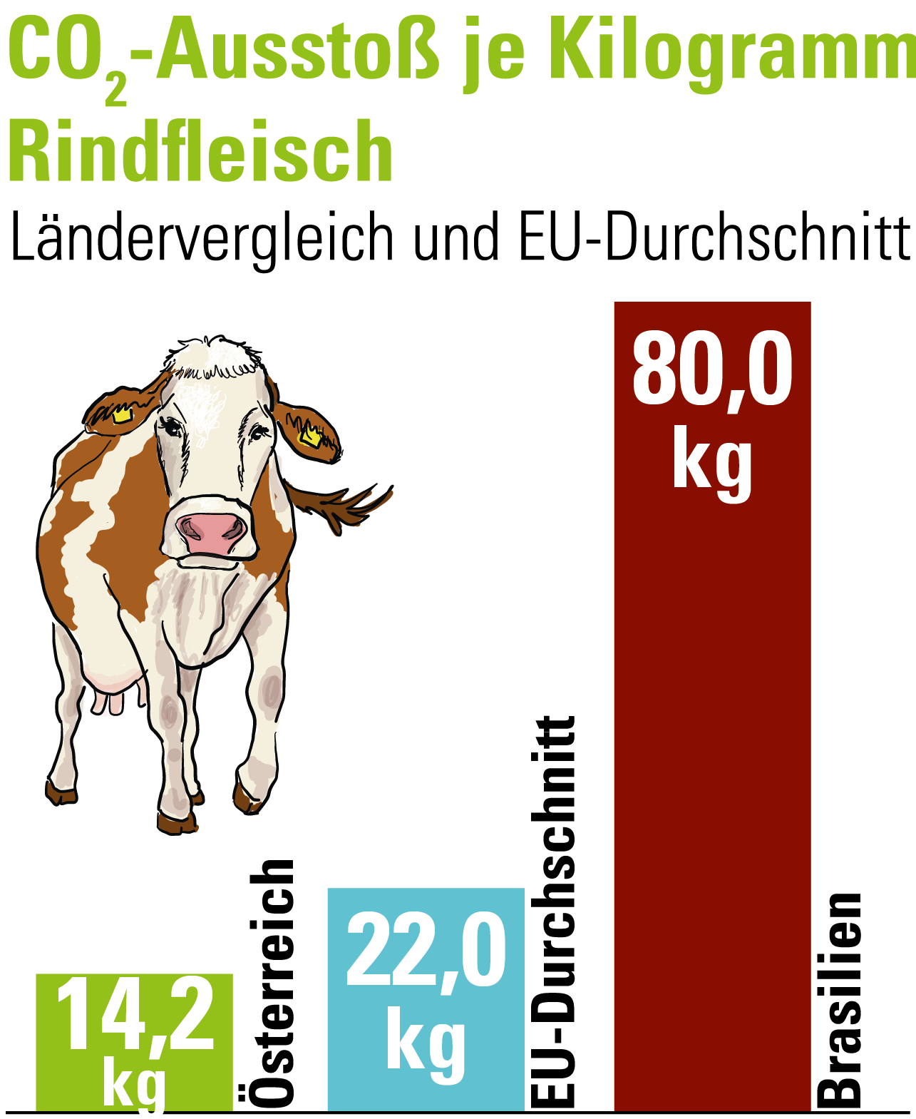- Ein österreichisches Rind erzeugt um 55 % weniger Treibhausgase als ein EU-Durchschnittsrind. Während ein österreichisches Rind bei der Produktion von einem Kilogramm Rindfleisch 14,2 Kilogramm Treibhausgas ausstößt, verursacht ein Rind im EU-Durchschnitt 22 Kilogramm Treibhausgas je Kilogramm Rindfleisch. Ein brasilianisches Rind verursacht mit 80 Kilogramm gar 5,6-mal so viele Treibhausgasemissionen je Kilogramm Rindfleisch wie ein österreichisches Rind.