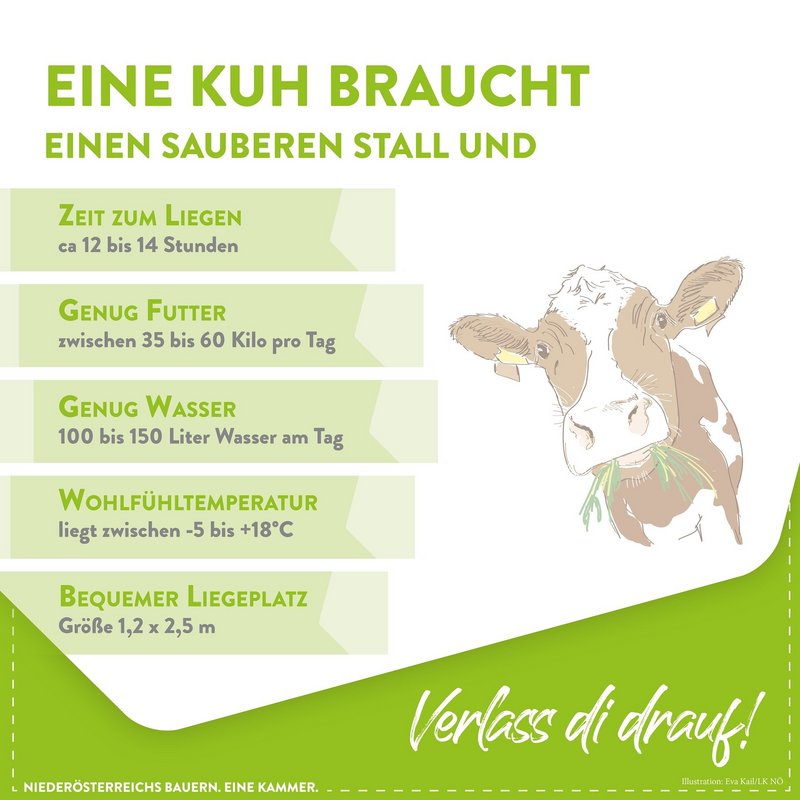 Wie für uns Menschen hat auch der Tag einer Kuh nur 24 Stunden. Davon verbringt sie zwölf bis 14 Stunden mit Liegen. Drei bis sechs Stunden sind für Fressen und Trinken reserviert. Zwei bis acht Stunden steht oder bewegt sich das Tier und geht sozialen Kontakten nach. Zwei bis drei Stunden lang wird gemolken.