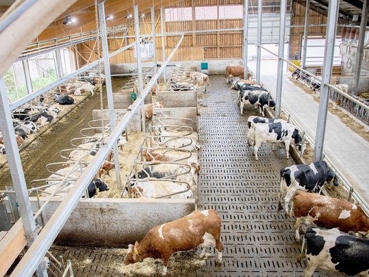 Laufstall: Hier haben Kühe Bewegungsfreiheit, können fressen, chillen oder herumspazieren.
