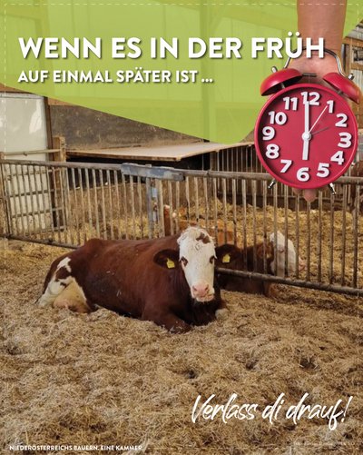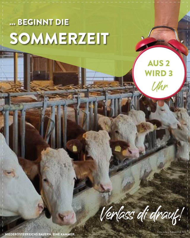Kühe lieben Routine – jeden Tag die gleichen Abläufe, feste Zeiten für Fressen, Liegen und Wiederkäuen. Ihr Tagesablauf wird vor allem vom natürlichen Tageslicht gesteuert, nicht von unserer Uhr. Deshalb kann es ganz schön irritierend sein, wenn die Zeitumstellung erfolgt und der/die Landwirt:in im März plötzlich eine Stunde früher in den Stall kommt: Die Damen liegen noch gemütlich wiederkäuend und schauen einen verdutzt an. Im Oktober ist es genau andersrum – da würden die die Kühe schon bereitstehen und ungeduldig auf das Melken warten.