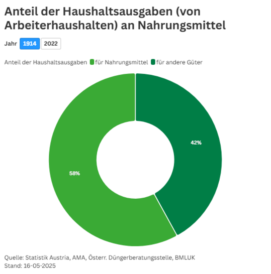Die Ausgaben für Lebensmittel sind in den letzten 30 Jahren stark gesunken. Nur noch 13% seines Einkommens gibt man heute für Essen und Trinken aus.