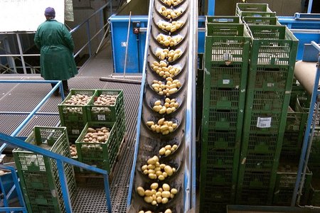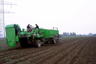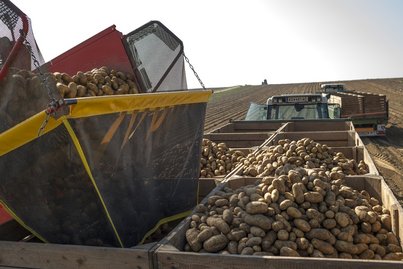 © AMA Marketing Geerntet werden die Erdäpfel mit einer Vollernte-Maschine, welche die Erdäpfeldämme mit den Knollen aufnimmt, das Laub abtrennt und anschließend die Knollen über ein Fließband weiterbefördert, sodass sie von der Erde befreit werden. Händisch werden beim Fließband außerdem Steine, kranke, als auch beschädigte Erdäpfel entfernt. Abschließend wird die Erntemenge verladen und abtransportiert.