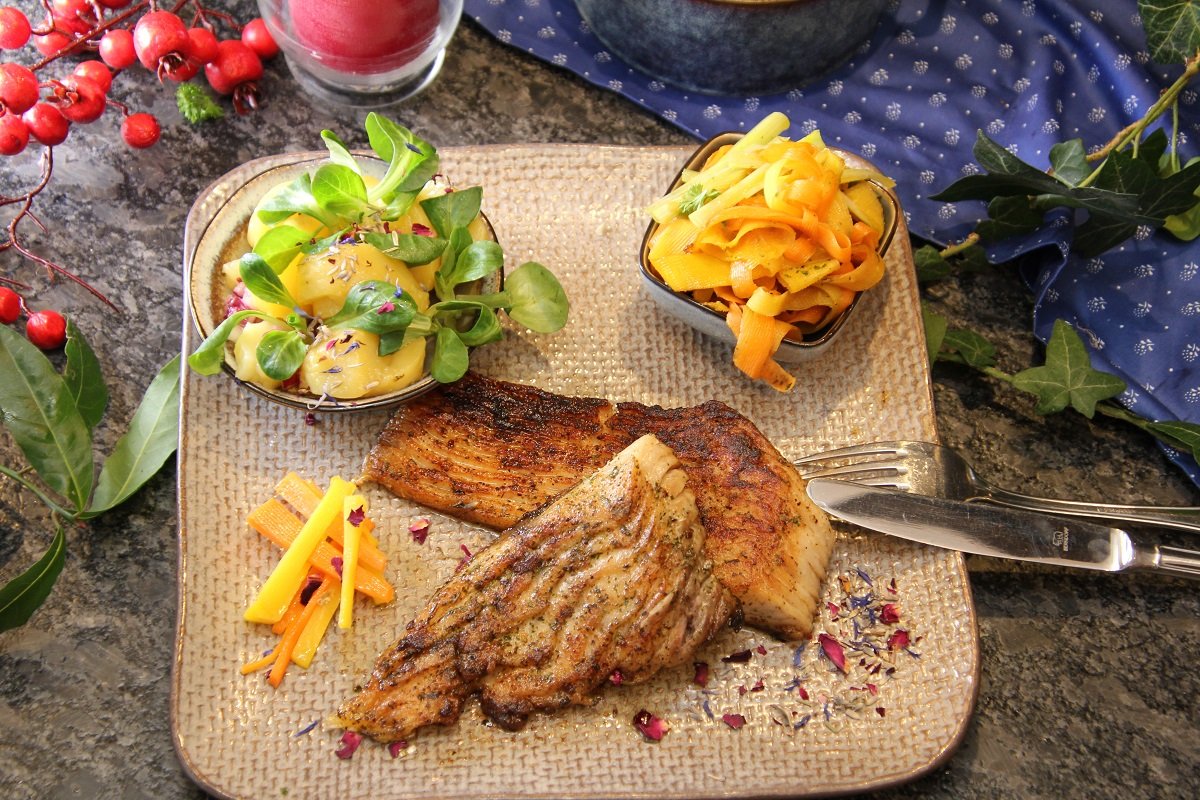- Koteletts oder Steaks sind vertikal zur Wirbelsäule in Scheiben geschnittenes Fischfleisch.